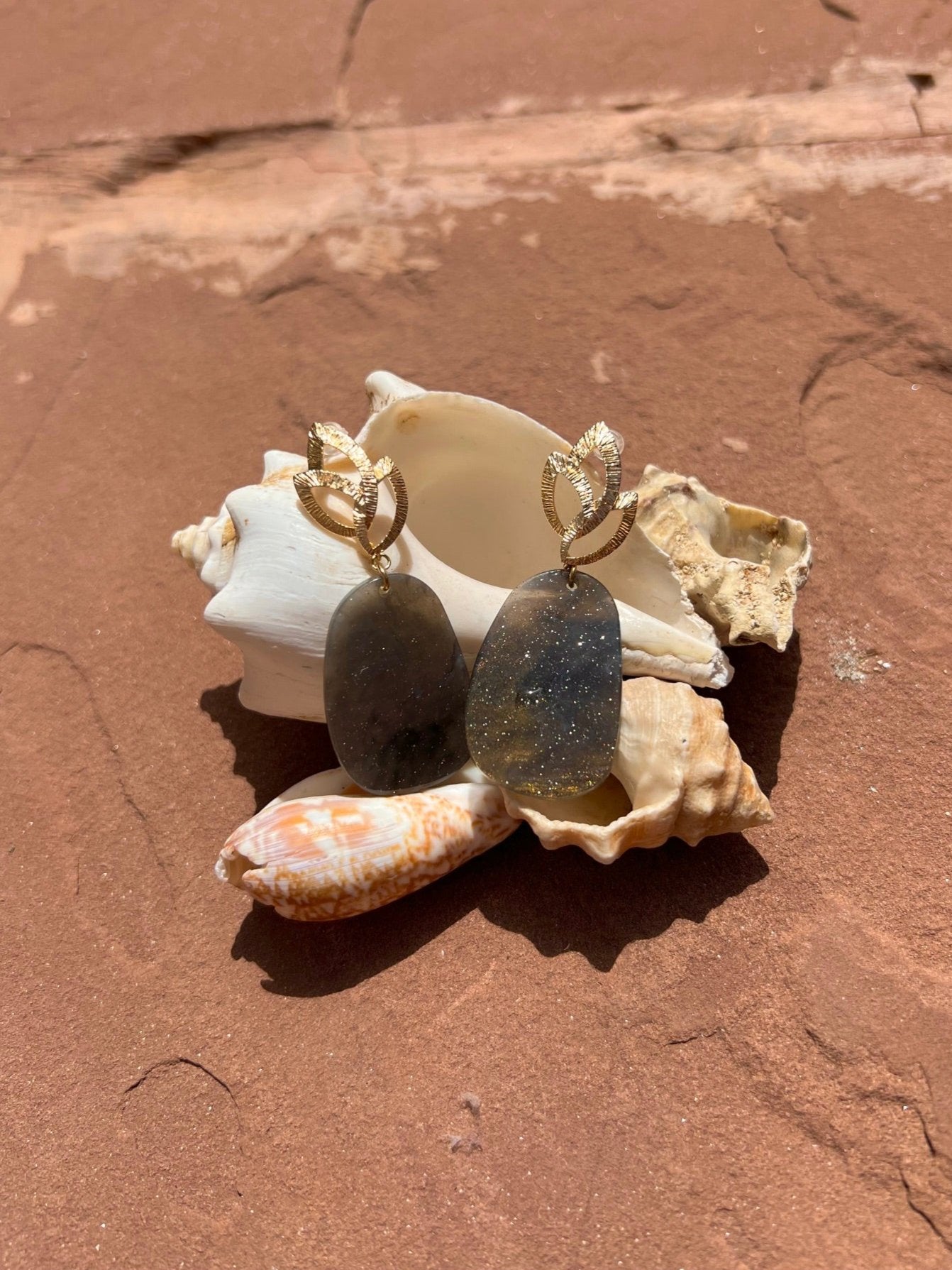 Les boucles Aria en forme de tulipe sont dorées à l’or fin. C’est-à-dire que le métal est recouvert d’une fine couche d’or. Cette boucle est accompagnée d’une acétate nébuleuse. L’acétate est légèrement brillante et la couleur varie du doré au gris. Vous ne pourrez plus vous en passer pour sortir.