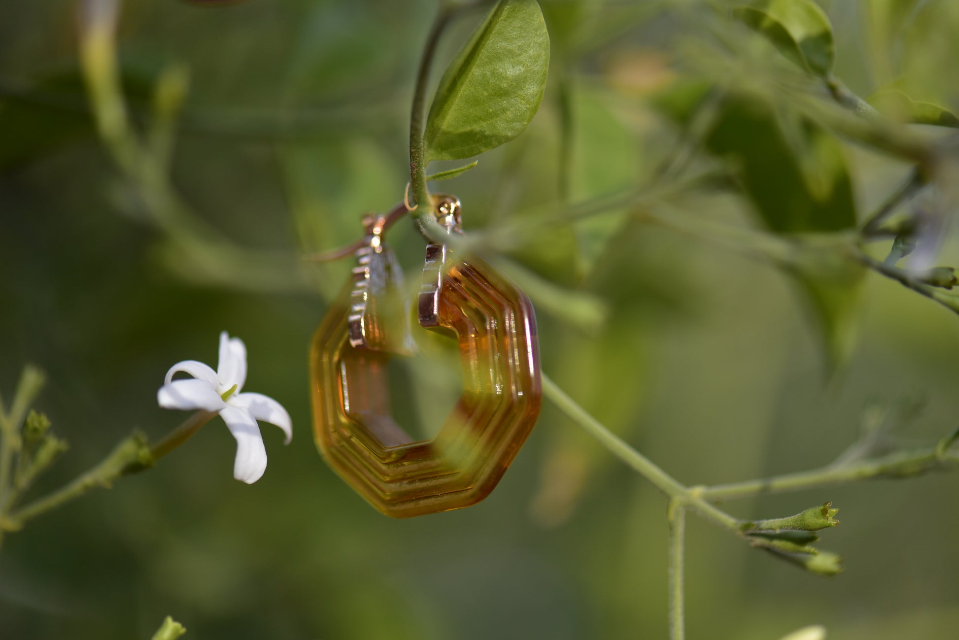 Tendance et vintage, les boucles Maeva en résine hexagonale de couleur marron transparent sont agrémentées d'une attache dorée en acier inoxydable.