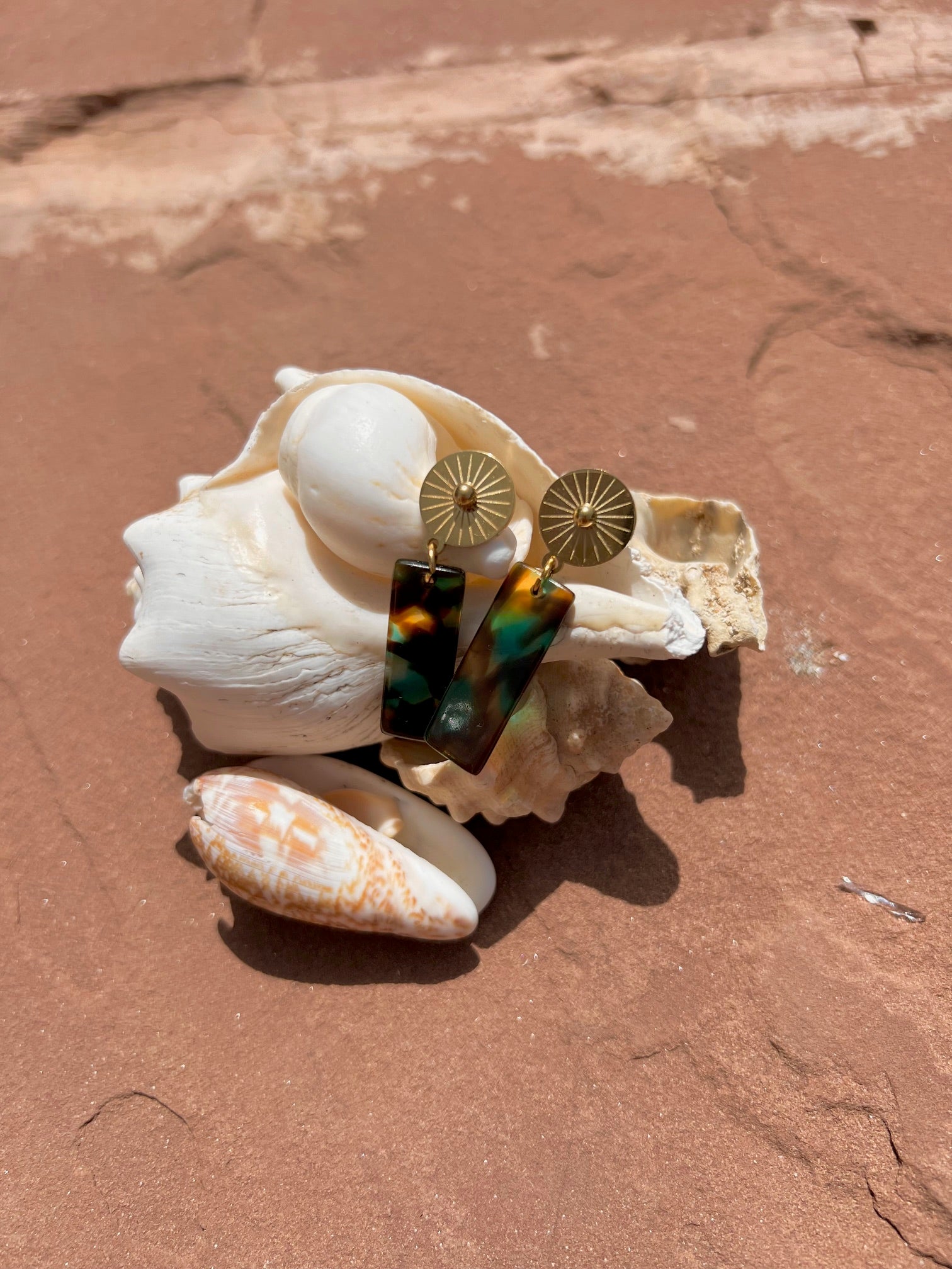 Les boucles Chloé en acier inoxydable sont dessinées d’un soleil pour illuminer vos plus belles tenues. Elles sont accompagnées d’une acétate transparente aux reflets turquoise et marron.