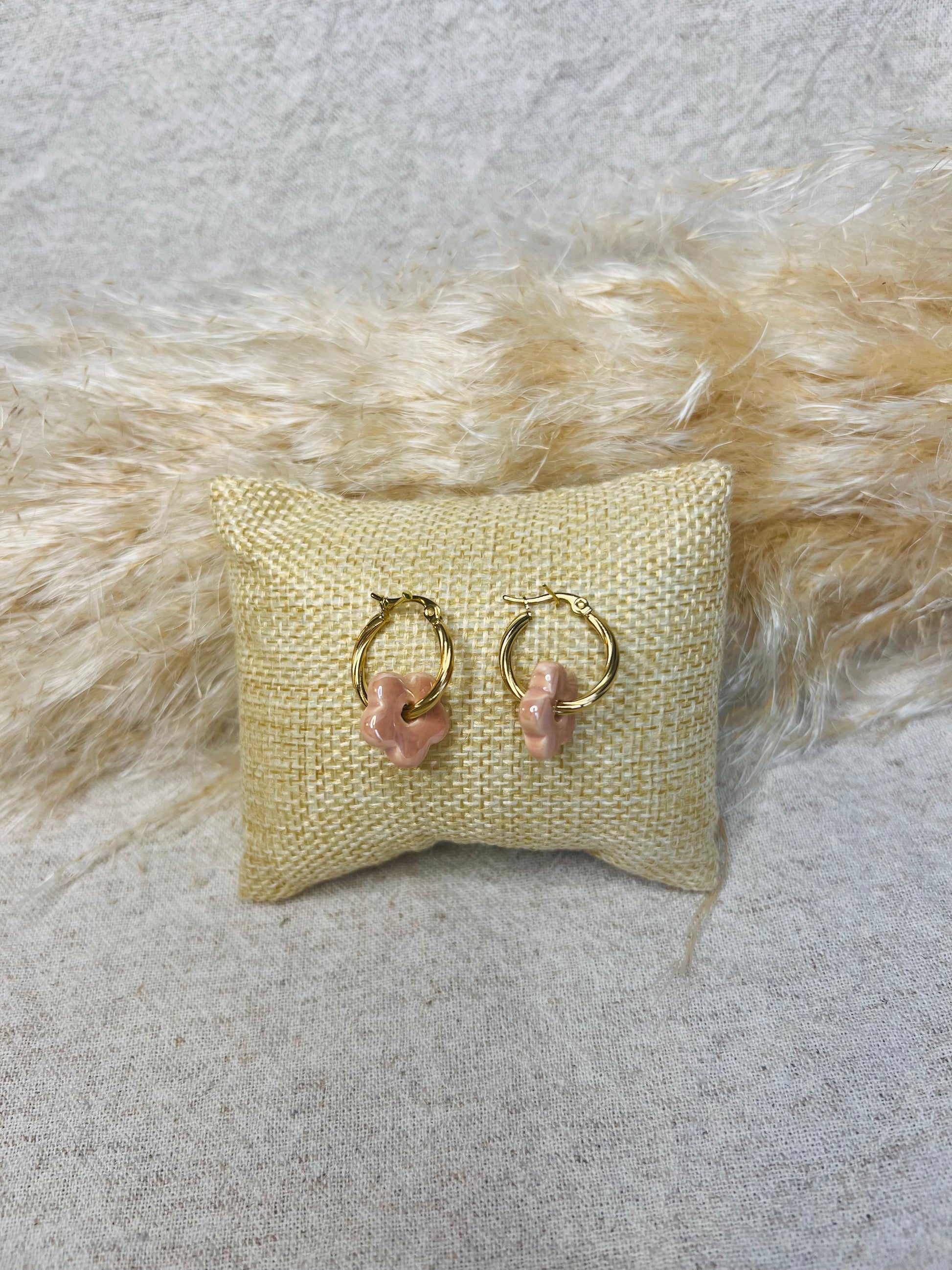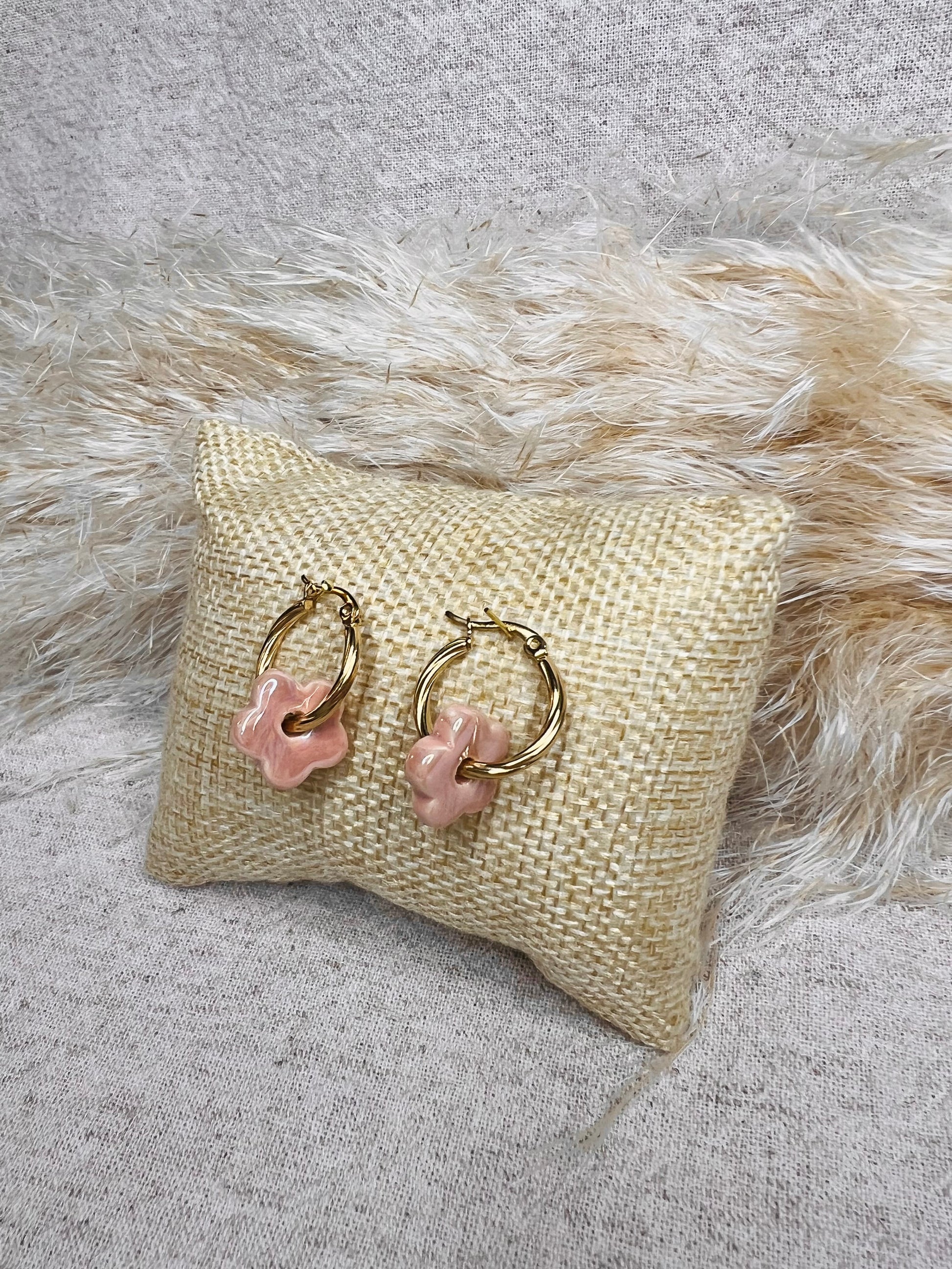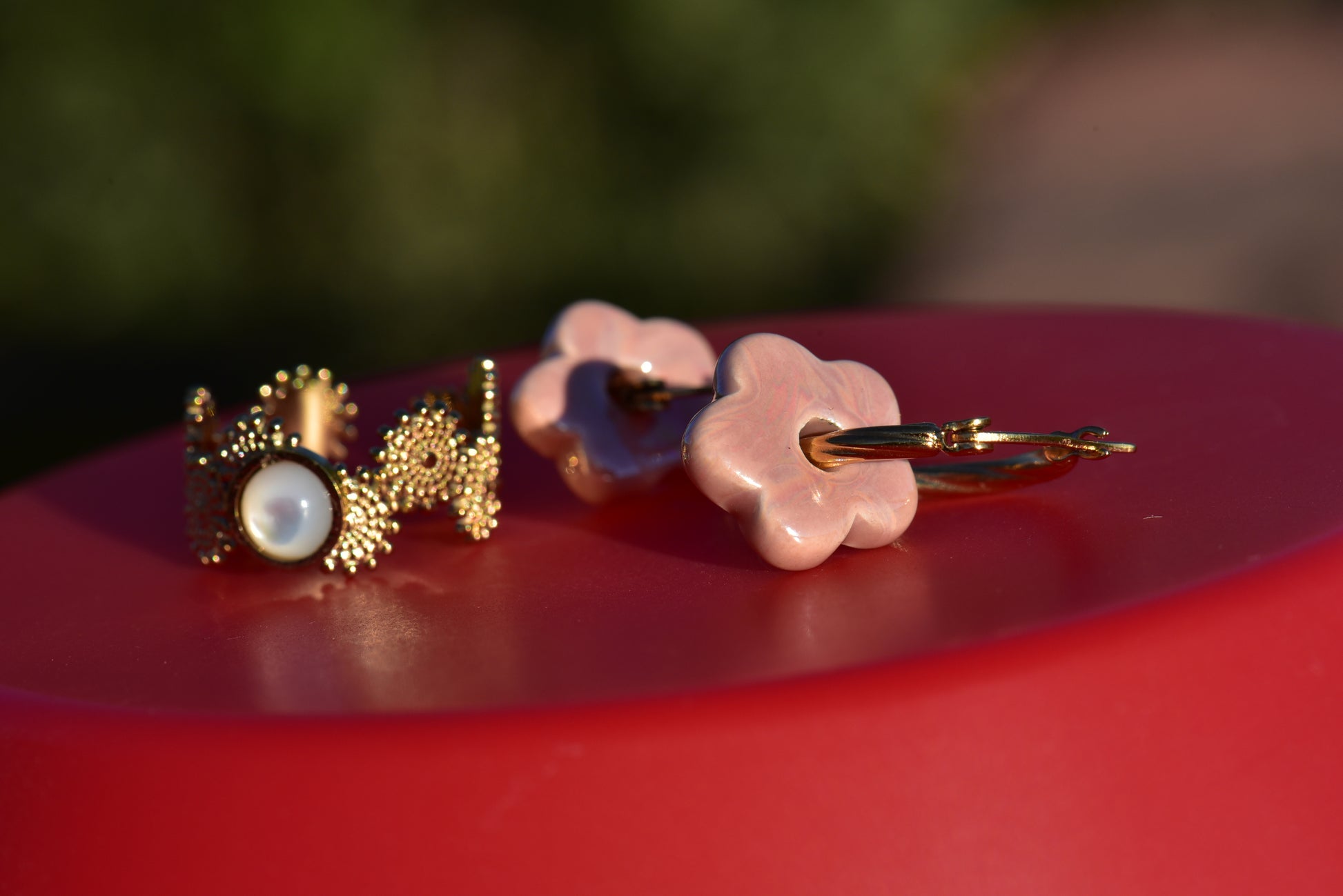 Les créoles Floriane, ciselées et ornées d'une délicate fleur en céramique DQ rose, sont le complément parfait au collier Rose.