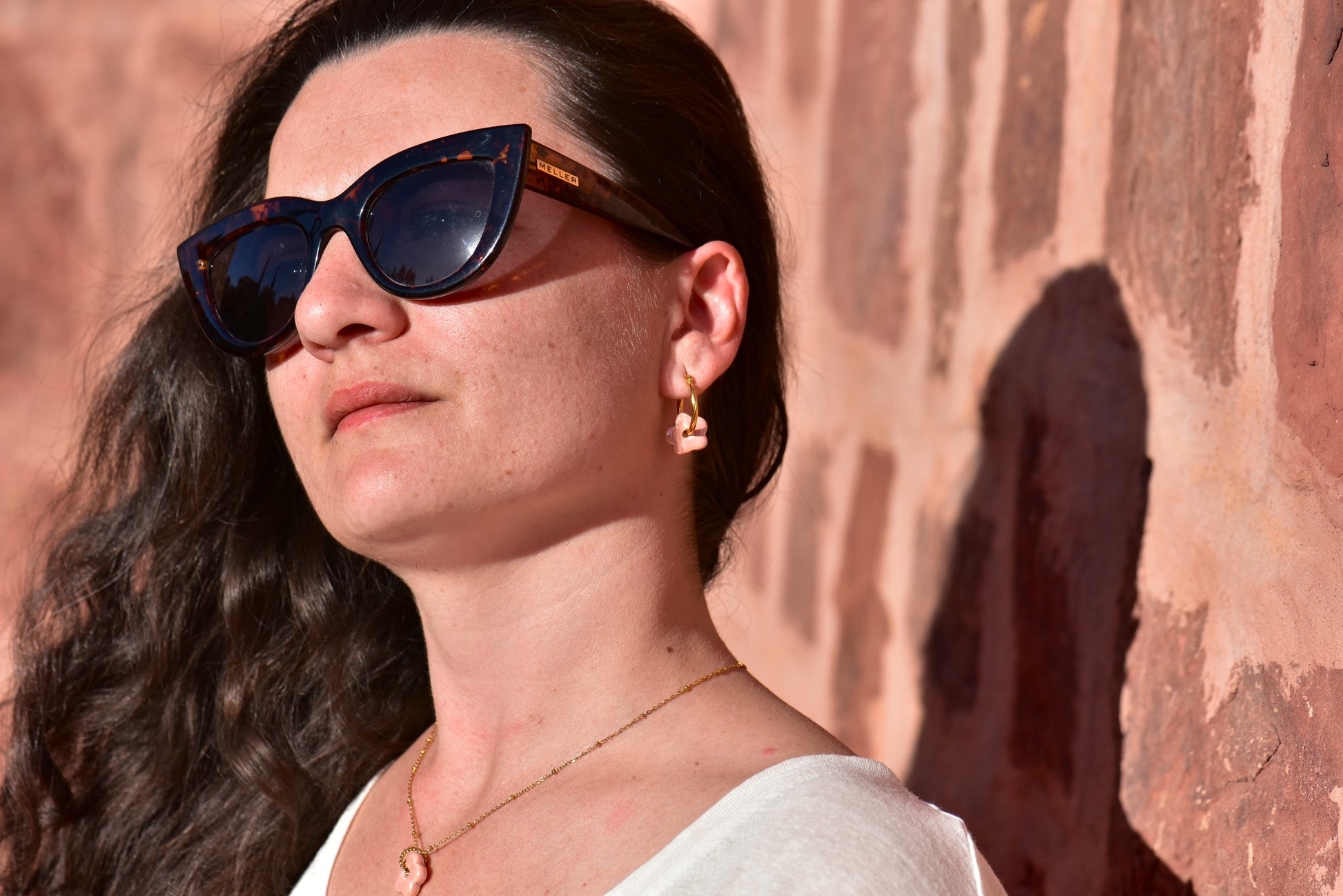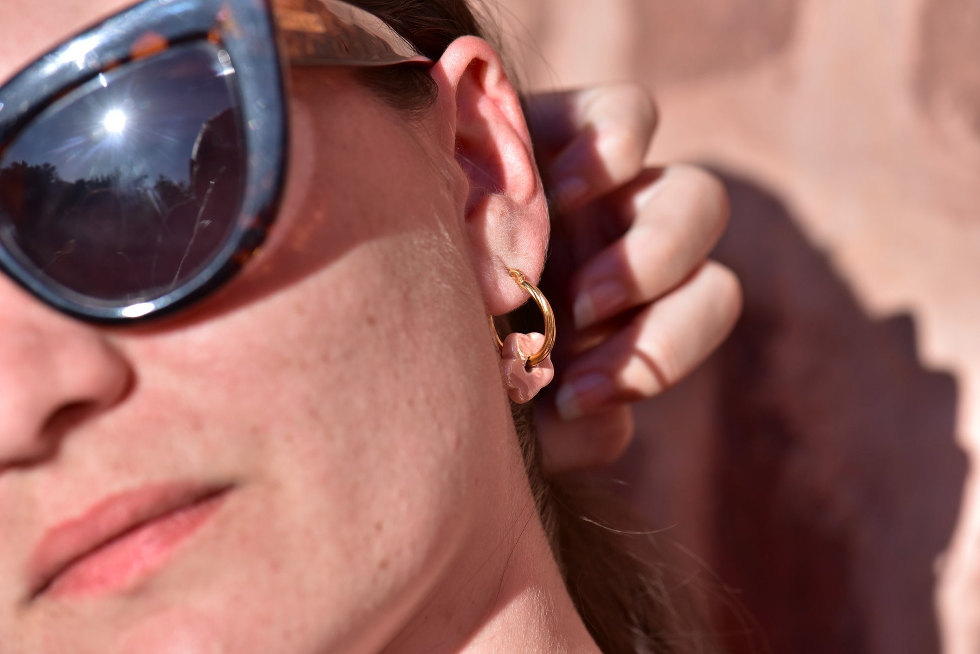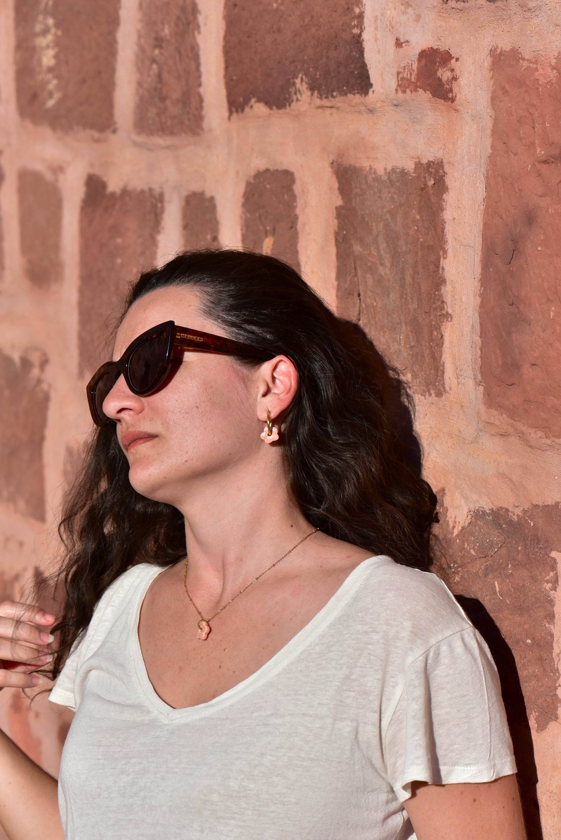 Les créoles Floriane, ciselées et ornées d'une délicate fleur en céramique DQ rose, sont le complément parfait au collier Rose.