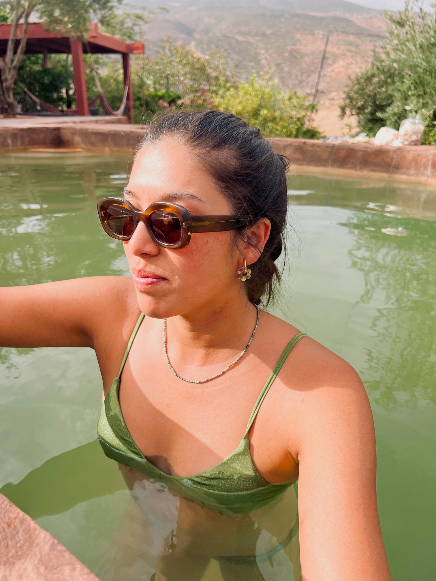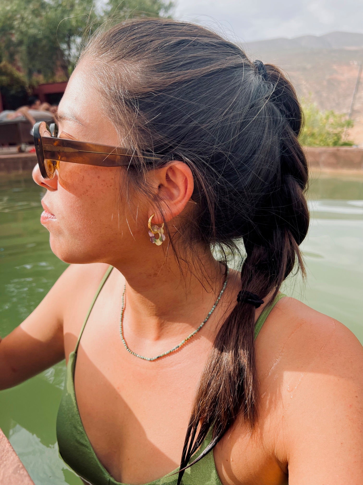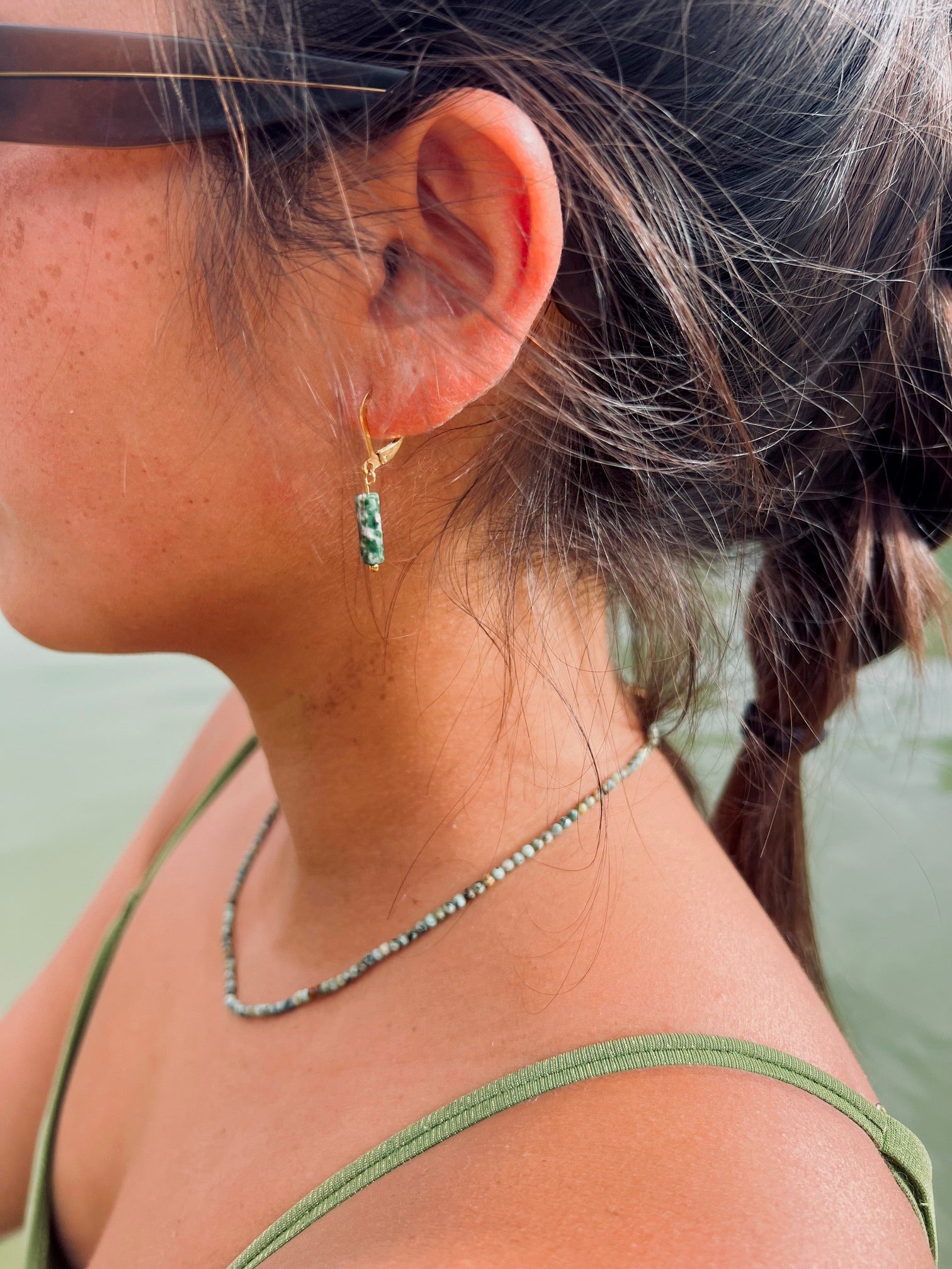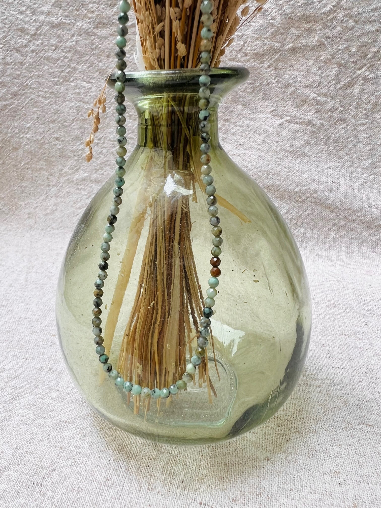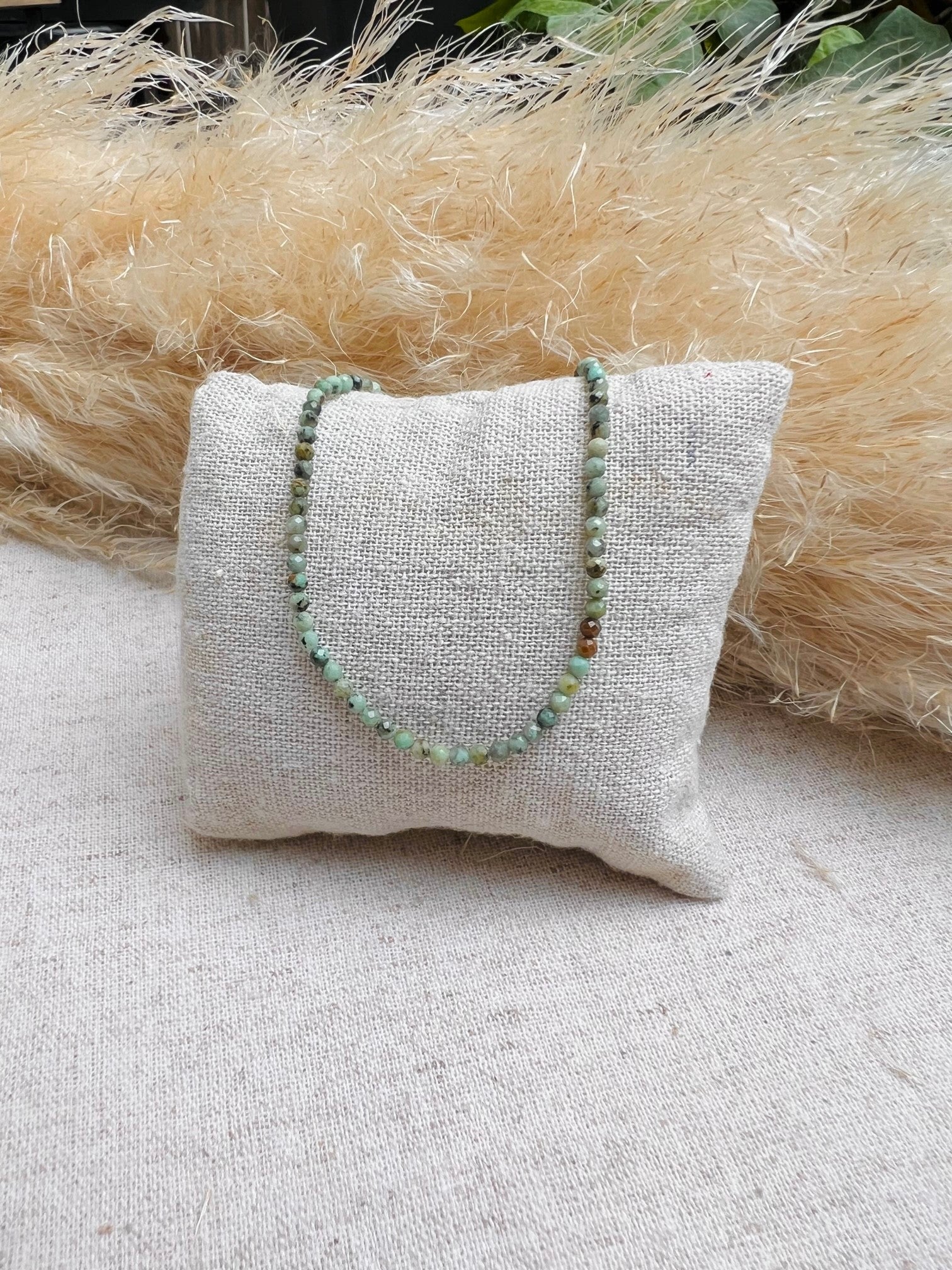 Le collier Madi est créé à partir d'un enfilage de pierres naturelles de turquoises africaines. Ce collier fin pourra se porter au quotidien seul ou accompagne d’un autre collier.